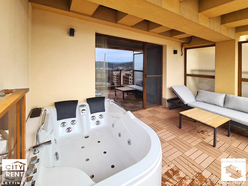 Additionally, the property includes an entrance hall, a bathroom with toilet, and a spacious terrace, which serves as a natural extension of the home and is arranged as a perfect relaxation area, equipped with a sun lounger and a hydromassage hot tub for two. The apartment is heated by electricity via air conditioning.
