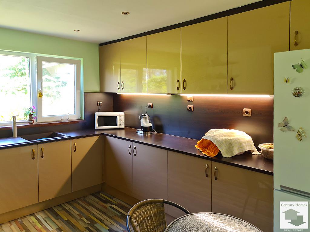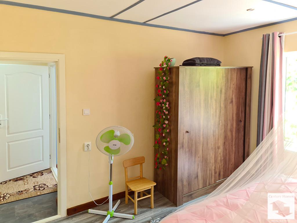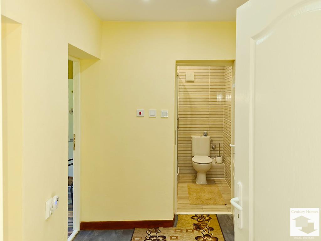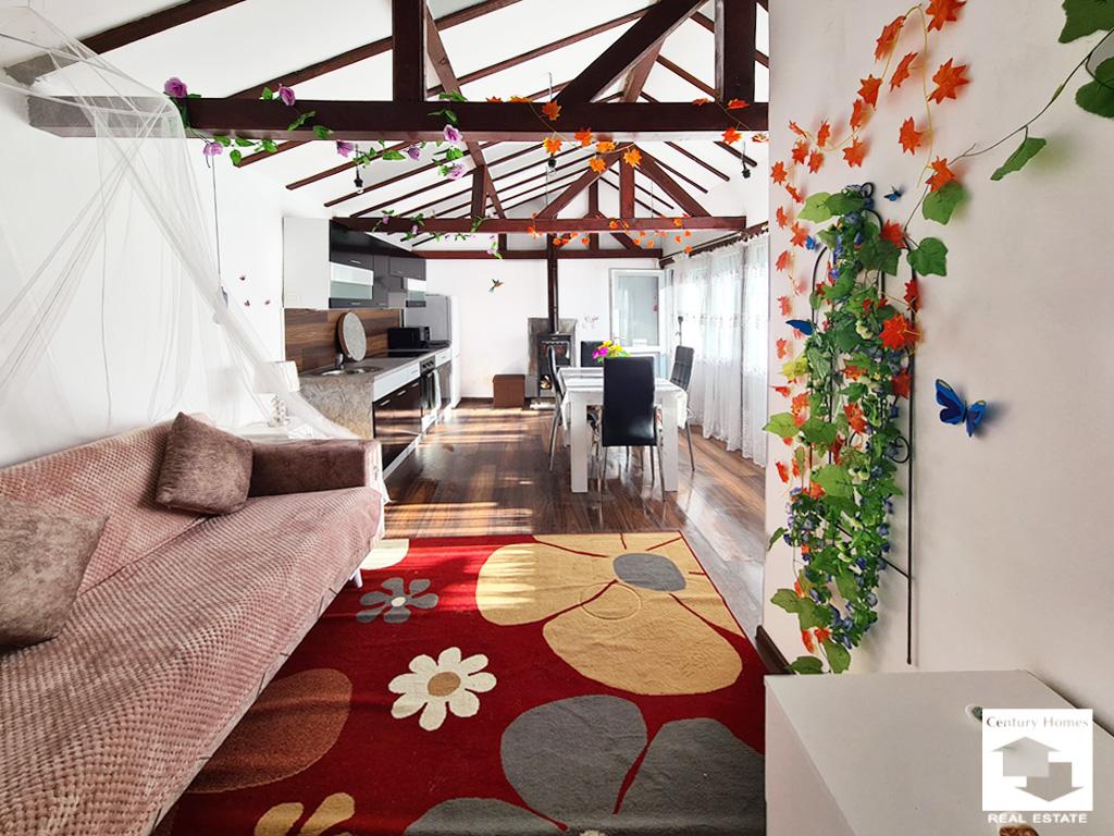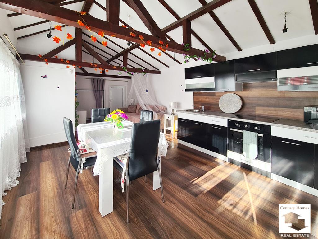 Пристройка до къщата (33 кв. м.) е също обновена и обособена като лятна кухня с трапезария и кът за почивка, преминаваща към коридор, даващ достъп до втора баня с тоалетна, както и стъпала към просторна маза под къщата.