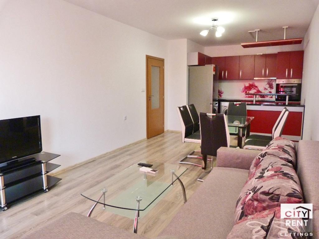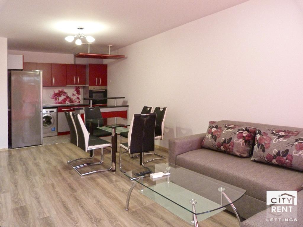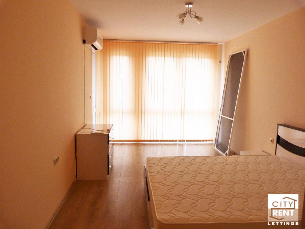 Fully-furnished one-bedroom apartment for rent. The living-area of the flat is 69 sq.m and offers the following premises: one bedroom, a living-room with fully-equipped kitchen, a bathroom/toilet, a terrace. The flat is set on 3rd middle floor of newly-built building and has entirely south exposure. The interior benefits from laminated and terracotta-tiled floorings, latex painted walls, PVC window frames and MDF interior doors. The property has an outside insulation. The apartment is offered fully furnished with all appliances - a fridge, an oven, a washing machine, a TV, two H/C air-conditioners. The property is located in a very sought-after and communicative area, offering easy access to schools, kindergartens, local stores, bars and supermarkets. Available from April 1, 2026. Please note that all original property prices are in Euros. All prices in GBP and USD are approximate and valid only on the day of uploading the corresponding property.